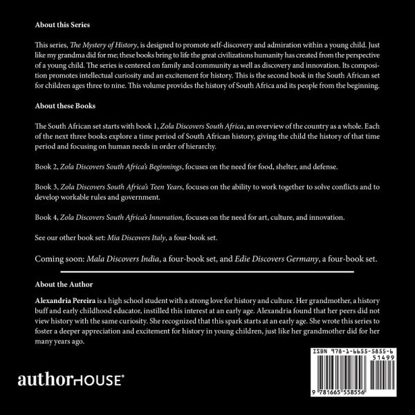 About this Series This series, The Mystery of History, is designed to promote self-discovery and admiration within a young child. Just like my grandma did for me; these books bring to life the great civilizations humanity has created from the perspective of a young child. The series is centered on family and community as well as discovery and innovation. Its composition promotes intellectual curiosity and an excitement for history. This is the second book in the South African set for children ages three to nine. This volume provides the history of South Africa and its people from the beginning. About these Books The South African set starts with book 1, Zola Discovers South Africa, an overview of the country as a whole. Each of the next three books explore a time period of South African history, giving the child the history of that time period and focusing on human needs in order of hierarchy. Book 2, Zola Discovers South Africa's Beginnings, focuses on the need for food, shelter, and defense. Book 3, Zola Discovers South Africa's Teen Years, focuses on the ability to work together to solve conflicts and to develop workable rules and government. Book 4, Zola Discovers South Africa's Innovation, focuses on the need for art, culture, and innovation. See our other book set: Mia Discovers Italy, a four-book set. Coming soon: Mala Discovers India, a four-book set, and Edie Discovers Germany, a four-book set.