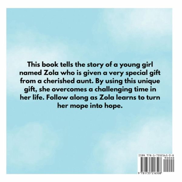 This book tells the story of a young girl named Zola who is given a very special gift from a cherished aunt. By using this unique gift, she overcomes a challenging time in her life. Follow along as Zola learns to turn her mope to hope.
