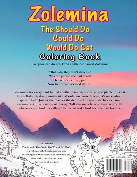 A great coloring book for kids that love cats with an inspiring rhyming story! This book includes 34 high-quality whimsical images designed to engage, inspire and captivate young artists imagination, providing hours of coloring fun. Kids can use crayons, pencil crayons, markers, or even paint to bring the compelling pages to full color life. With the small courageous cat Zolemina as the main character on her compiling journey, these coloring pages are also filled with a large number of other intriguing animal characters. The inspiring story of "Zolemina The Should Do Would Do Could Do Cat", written in rhyme, is incorporated into each of the coloring pages. Zolemina is on a quest to fulfill her dream, but negativity and taunting by a number of animals causes her vibrant spirit to fade. BUT when Zolemina has a chance encounter with a benevolent bluejay everything changes forever. It is a coloring books that also has an empowering message about the power of positive thinking, perseverance, kindness and friendship.