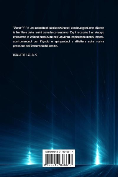 "Zona 99" è una raccolta di storie avvincenti e coinvolgenti che sfidano le frontiere della realtà come la conosciamo. Ogni racconto è un viaggio attraverso le infinite possibilità dell'universo, esplorando mondi lontani, confrontandoci con l'ignoto e spingendoci a riflettere sulla nostra posizione nell'immensità del cosmo. VOLUME 1-2-3-4