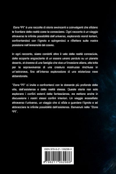 "Zona 99" è una raccolta di storie avvincenti e coinvolgenti che sfidano le frontiere della realtà come la conosciamo. Ogni racconto è un viaggio attraverso le infinite possibilità dell'universo, esplorando mondi lontani, confrontandoci con l'ignoto e spingendoci a riflettere sulla nostra posizione nell'immensità del cosmo. In ogni racconto, siamo condotti oltre il velo della realtà conosciuta, dalla scoperta angosciante di un essere umano perduto su un pianeta deserto, al dramma di una famiglia che vive un'invasione aliena, alla lotta per la sopravvivenza di una creatura mostruosa rinchiusa in un'astronave, fino all'intensa esplorazione di una misteriosa nave abbandonata. "Zona 99" ci invita a confrontarci con le domande più profonde della vita, dell'esistenza e della realtà stessa. Queste storie non solo esplorano i confini esterni della fantascienza, ma mettono anche indiscussione i nostri stessi confini interiori. Un viaggio mozzafiato attraverso l'universo, un viaggio che ci sfida a guardare l'ignoto e ad abbracciare le infinite possibilità dell'esistenza. Benvenuti nella "Zona99". Volume 1