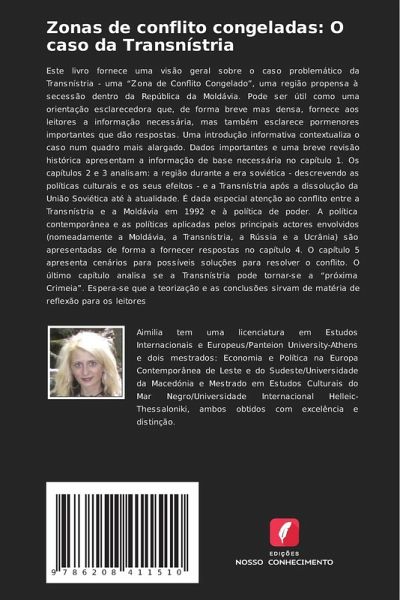 Este livro fornece uma visão geral sobre o caso problemático da Transnístria - uma "Zona de Conflito Congelado", uma região propensa à secessão dentro da República da Moldávia. Pode ser útil como uma orientação esclarecedora que, de forma breve mas densa, fornece aos leitores a informação necessária, mas também esclarece pormenores importantes que dão respostas. Uma introdução informativa contextualiza o caso num quadro mais alargado. Dados importantes e uma breve revisão histórica apresentam a informação de base necessária no capítulo 1. Os capítulos 2 e 3 analisam: a região durante a era soviética - descrevendo as políticas culturais e os seus efeitos - e a Transnístria após a dissolução da União Soviética até à atualidade. É dada especial atenção ao conflito entre a Transnístria e a Moldávia em 1992 e à política de poder. A política contemporânea e as políticas aplicadas pelos principais actores envolvidos (nomeadamente a Moldávia, a Transnístria, a Rússia e a Ucrânia) são apresentadas de forma a fornecer respostas no capítulo 4. O capítulo 5 apresenta cenários para possíveis soluções para resolver o conflito. O último capítulo analisa se a Transnístria pode tornar-se a "próxima Crimeia". Espera-se que a teorização e as conclusões sirvam de matéria de reflexão para os leitores