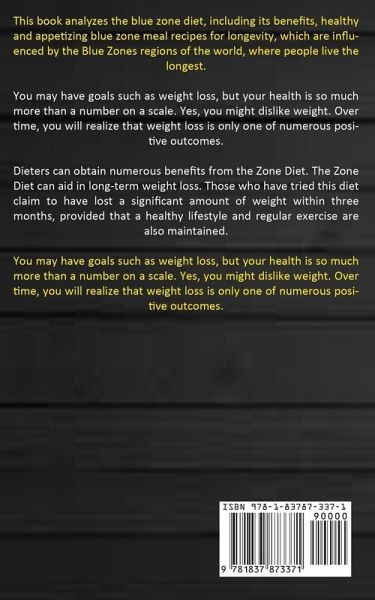 This book analyzes the blue zone diet, including its benefits, healthy and appetizing blue zone meal recipes for longevity, which are influenced by the Blue Zones regions of the world, where people live the longest. You may have goals such as weight loss, but your health is so much more than a number on a scale. Yes, you might dislike weight. Over time, you will realize that weight loss is only one of numerous positive outcomes. Dieters can obtain numerous benefits from the Zone Diet. The Zone Diet can aid in long-term weight loss. Those who have tried this diet claim to have lost a significant amount of weight within three months, provided that a healthy lifestyle and regular exercise are also maintained. You may have goals such as weight loss, but your health is so much more than a number on a scale. Yes, you might dislike weight. Over time, you will realize that weight loss is only one of numerous positive outcomes.