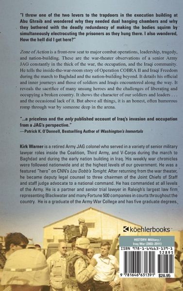 Zone of Action is a front-row seat to major combat operations, leadership, tragedy, and nation-building. These are the war-theater observations of a senior Army JAG constantly in the thick of the war, the occupation, and the Iraqi community. He tells the inside-the-war-room story of Operation COBRA II and Iraqi Freedom during the march to Baghdad and the nation-building beyond. It details his official and inner journeys and those of soldiers and Iraqis encountered along the way. It reveals the sacrifice of many unsung heroes and the challenges of liberating and occupying a broken country. It shows the character of our soldiers and leaders . . . and the occasional lack of it. But above all things, it is an honest, often humorous romp through war by someone deep in the arena.