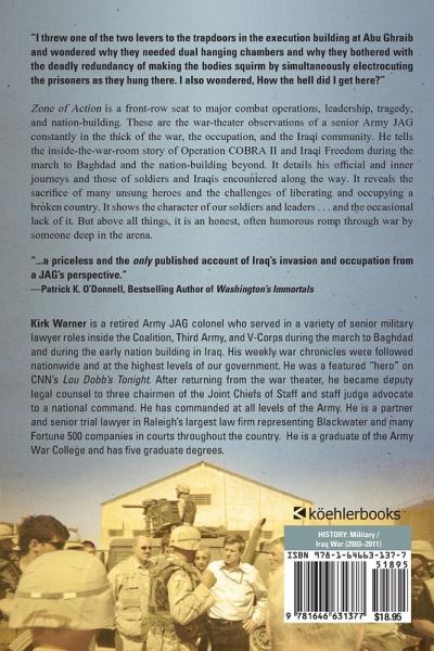 Zone of Action is a front-row seat to major combat operations, leadership, tragedy, and nation-building. These are the war-theater observations of a senior Army JAG constantly in the thick of the war, the occupation, and the Iraqi community. He tells the inside-the-war-room story of Operation COBRA II and Iraqi Freedom during the march to Baghdad and the nation-building beyond. It details his official and inner journeys and those of soldiers and Iraqis encountered along the way. It reveals the sacrifice of many unsung heroes and the challenges of liberating and occupying a broken country. It shows the character of our soldiers and leaders . . . and the occasional lack of it. But above all things, it is an honest, often humorous romp through war by someone deep in the arena.