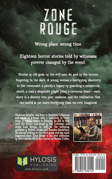 Alphonse Schaller was born in Southern California and raised in a house with a bookshelf in every room. A regular visitor to libraries, he fell in love with the horror and dread of H.P. Lovecraft and Jorge Luis Borges, as well as the sweeping fantasies of Robert Jordan and Brandon Sanderson. He started writing in the third grade and has much improved since. Zone Rouge is his first collection of short stories. He is also known as Rowan Cullen.