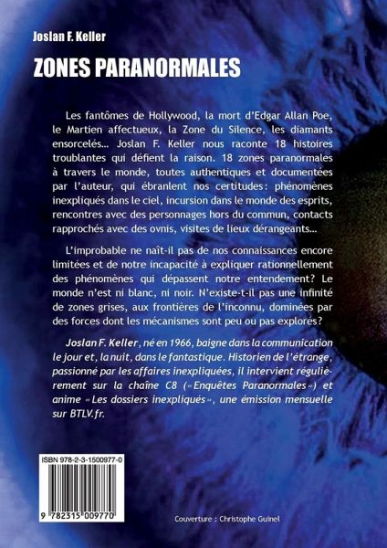 Les fantômes de Hollywood, la mort d'Edgar Allan Poe, le Martien affectueux, la Zone du Silence, les diamants ensorcelés... Joslan F. Keller nous raconte 18 histoires troublantes qui défient la raison. 18 zones paranormales à travers le monde, toutes authentiques et documentées par l'auteur, qui ébranlent nos certitudes¿: phénomènes inexpliqués dans le ciel, incursion dans le monde des esprits, rencontres avec des personnages hors du commun, contacts rapprochés avec des ovnis, visites de lieux dérangeants...L'improbable ne naît-il pas de nos connaissances encore limitées et de notre incapacité à expliquer rationnellement des phénomènes qui dépassent notre entendement¿? Le monde n'est ni blanc, ni noir. N'existe-t-il pas une infinité de zones grises, aux frontières de l'inconnu, dominées par des forces dont les mécanismes sont peu ou pas explorés¿?