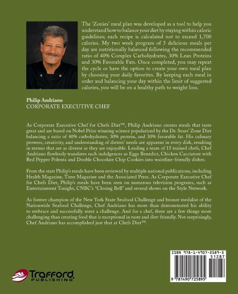 The 'Zonies' meal plan was developed as a tool to help you understand how to balance your diet by staying within caloric guidelines; each recipe is calculated not to exceed 1,700 calories. My two week program of 5 delicious meals per day are nutritionally balanced following the recommended ratio of 40% Complex Carbohydrates, 30% Lean Proteins and 30% Favorable Fats. Once completed, you may repeat the cycle or have the option to create your own meal plan by choosing your daily favorites. By keeping each meal in order and balancing your day within the limit of suggested calories, you will be on a healthy path to weight loss.…mehr