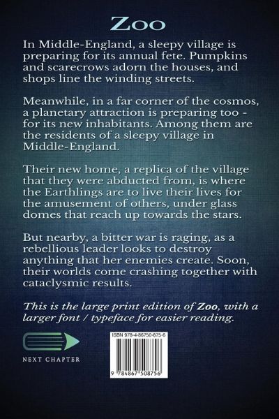 In Middle-England, a sleepy village is preparing for its annual fete. Pumpkins and scarecrows adorn the houses, and shops line the winding streets. Meanwhile, in a far corner of the cosmos, a planetary attraction is preparing too - for its new inhabitants. Among them are the residents of a sleepy village in Middle-England. Their new home, a replica of the village that they were abducted from, is where the Earthlings are to live their lives for the amusement of others, under glass domes that reach up towards the stars. But nearby, a bitter war is raging, as a rebellious leader looks to destroy anything that her enemies create. Soon, their worlds come crashing together with cataclysmic results. This is the large print edition of Zoo, with a larger font / typeface for easier reading.¿