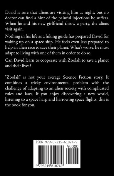 David is sure that aliens are visiting him at night, but no doctor can find a hint of the painful injections he suffers. When he and his new girlfriend throw a party, the aliens visit again. Nothing in his life as a hiking guide has prepared David for waking up on a space ship. He feels even less prepared to help an alien race to save their planet. What's worse, he must adapt to living with one of them in order to do so. Can David learn to cooperate with Zoolah to save a planet and their lives? "Zoolah" is not your average Science Fiction story. It combines a tricky environmental problem with the challenge of adapting to an alien society with complicated rules and laws. If you enjoy discovering a new world, listening to a space harp and harrowing space flights, this is the book for you.