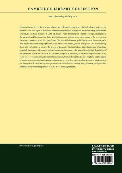 Erasmus Darwin (1731-1802) is remembered not only as the grandfather of Charles but as a pioneering scientist in his own right. A friend and correspondent of Josiah Wedgwood, Joseph Priestley and Matthew Boulton, he practised medicine in Lichfield, but also wrote prolifically on scientific subjects. He organised the translation of Linnaeus from Latin into English prose, coining many plant names in the process, and also wrote a version in verse, The Loves of Plants. The aim of his Zoonomia, published in two volumes (1794-6), is to 'reduce the facts belonging to animal life into classes, orders, genera, and species; and by comparing them with each other, to unravel the theory of diseases'. The first volume describes human physiology, especially importance of motion, both voluntary and involuntary; the second is a detailed description of the symptoms of, and the cures for, diseases, categorised according to his physiological classes.