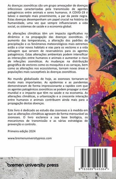 As doenças zoonóticas são um grupo ameaçador de doenças infecciosas caracterizadas pela transmissão de agentes patogénicos entre animais e seres humanos. A COVID-19 é talvez o exemplo mais proeminente, a par da peste negra. Estas doenças desempenham um papel crucial na história da humanidade, uma vez que sempre influenciaram a vida social, os sistemas de saúde e a economia global. As alterações climáticas têm um impacto significativo na dinâmica e na propagação das doenças zoonóticas. O aumento das temperaturas, a alteração dos padrões de precipitação e os fenómenos meteorológicos mais extremos estão a criar novos habitats e vias para os vectores e a vida selvagem que servem de reservatórios para os agentes patogénicos. Estas alterações ambientais podem intensificar as interacções entre humanos e animais e aumentar o risco de infecções zoonóticas. As mudanças na distribuição geográfica de vectores como os mosquitos e as carraças, bem como as alterações nos ecossistemas, tornam novas áreas e populações mais susceptíveis às doenças zoonóticas. No mundo globalizado de hoje, as zoonoses tornaram-se muito mais importantes. As epidemias e as pandemias demonstraram de forma impressionante a rapidez com que os agentes patogénicos zoonóticos se podem propagar a nível mundial e o impacto que têm na saúde e na economia. As alterações climáticas, a urbanização e a crescente interação entre humanos e animais contribuem ainda mais para a propagação destas doenças. Este livro é dedicado ao estudo das zoonoses e à medida em que as alterações climáticas agravam de forma mensurável as zoonoses. O livro esclarece a sua base biológica, os mecanismos de transmissão e as várias estratégias de prevenção e controlo.