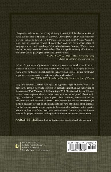Zoopoetics assumes Aristotle was right. The general origin of poetry resides, in part, in the instinct to imitate. But it is an innovative imitation. An exploration of the oeuvres of Walt Whitman, E. E. Cummings, W. S. Merwin, and Brenda Hillman reveals the many places where an imitation of another species' poiesis (Greek, makings) contributes to breakthroughs in poetic form. However, humans are not the only imitators in the animal kingdom. Other species, too, achieve breakthroughs in their makings through an attentiveness to the ways-of-being of other animals. For this reason, mimic octopi, elephants, beluga whales, and many other species join the exploration of what zoopoetics encompasses. Zoopoetics provides further traction for people interested in the possibilities when and where species meet. Gestures are paramount to zoopoetics. Through the interplay of gestures, the human/animal/textual spheres merge making it possible to recognize how actual, biological animals impact the material makings of poetry. Moreover, as many species are makers, zoopoetics expands the poetic tradition to include nonhuman poiesis.
