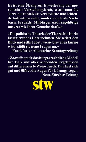 Massentierhaltung, Fleischskandale, Tierversuche - unser mehr als fragwürdiger Umgang mit Tieren ist längst kein Nischenthema mehr. Die öffentlichen Diskussionen beschränken sich allerdings zumeist auf Fragen der Moral und darauf, welche moralischen Rechte und Interessen wir Tieren aufgrund ihrer Eigenschaften und Fähigkeiten zuschreiben müssen. Donaldson und Kymlicka gehen weit darüber hinaus und behaupten, dass Tiere auch politische Rechte haben. Zoopolis entwirft so auf kluge wie eindringliche Weise eine neue und folgenreiche Agenda für das künftige Zusammenleben mit diesen Geschöpfen, denen wir mehr schulden als unser Mitleid.