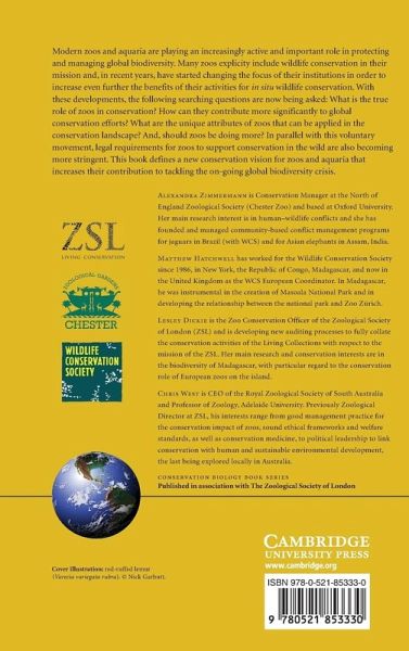 Modern zoos and aquaria are playing an increasingly active and important role in protecting and managing global biodiversity. Many zoos include wildlife conservation in their mission and have started changing the focus of their institutions in order to increase even further the benefits of their activities for in situ wildlife conservation. With these developments, the following searching questions are now being asked: What is the true role of zoos in conservation? How can they contribute more significantly to global conservation efforts? What are the unique attributes of zoos that can be applied in the conservation landscape? And should zoos be doing more? In parallel with this voluntary movement, legal requirements for zoos to support conservation in the wild are also becoming more stringent. This book defines a new conservation vision for zoos and aquaria that will be of interest to those working in zoos, alongside practitioners and researchers in conservation.