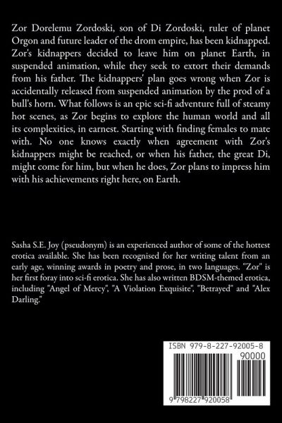 Zor Dorelemu Zordoski, son of Di Zordoski, ruler of planet Orgon and future leader of the drom empire, has been kidnapped. Zor's kidnappers decided to leave him on planet Earth, in suspended animation, while they seek to extort their demands from his father. The kidnappers' plan goes wrong when Zor is accidentally released from suspended animation by the prod of a bull's horn. What follows is an epic sci-fi adventure full of steamy hot scenes, as Zor begins to explore the human world and all its complexities, in earnest. Starting with finding females to mate with. No one knows exactly when agreement with Zor's kidnappers might be reached, or when his father, the great Di, might come for him, but when he does, Zor plans to impress him with his achievements right here, on Earth.