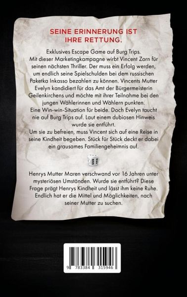 Seine Erinnerung ist ihre Rettung.Exklusives Escape Game auf Burg Trips. Mit dieser Marketingkampagne wirbt Vincent Zorn für seinen nächsten Thriller. Der muss ein Erfolg werden, um endlich seine Spielschulden bei dem russischen Paketka Inkasso bezahlen zu können. Vincents Mutter Evelyn kandidiert für das Amt der Bürgermeisterin Geilenkirchens und möchte mit ihrer Teilnahme bei den jungen Wählerinnen und Wählern punkten. Eine Win-win-Situation für beide. Doch Evelyn taucht nie auf Burg Trips auf. Laut einem dubiosen Hinweis wurde sie entführt.Um sie zu befreien, muss Vincent sich auf eine Reise in seine Kindheit begeben. Stück für Stück deckt er dabei ein grausames Familiengeheimnis auf.Henrys Mutter Maren verschwand vor 16 Jahren unter mysteriösen Umständen. Wurde sie entführt? Diese Frage prägt Henrys Kindheit und lässt ihm keine Ruhe. Endlich hat er die Mittel und Möglichkeiten, nach seiner Mutter zu suchen.