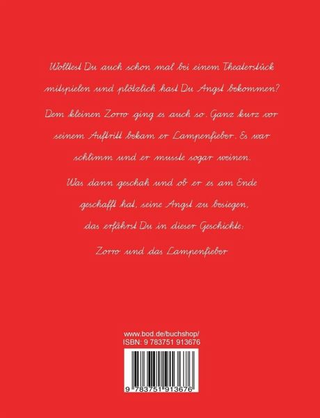 Wolltest Du auch schon mal bei einem Theaterstück mitspielen und plötzlich hast Du Angst bekommen? Dem kleinen Zorro ging es auch so. Ganz kurz vor seinem Auftritt bekam er Lampenfieber. Es war schlimm und er musste sogar weinen. Was dann geschah und ob er es am Ende geschafft hat, seine Angst zu besiegen, das erfährst Du in dieser Geschichte: Zorro und das Lampenfieber.Zorro und das Lampenfieber ist ein Kinderbuch von Kindern für Kinder. Es entstand im Rahmen einer schulischen Projektarbeit im 9. Jahrgang einer Gesamtschule in Schleswig-Holstein.Amelie Schlichting erdachte die Geschichte des jungen Zorro, Amy Quinn hauchte den Figuren der Geschichte mit ihren Illustrationen Leben ein, und Marlon Manger korrigierte und bearbeitete die Texte und Bilder, fügte alles zusammen und organisierte die Produktion des Buches.Das Buch ist ideal als Vorlesebuch und zum Lesen lernen geeignet. Durch die vielen Illustrationen werden auch die Kleinsten Leseanfänger angesprochen. Es ist in 2 Ausgaben erhältlich, eine Ausgabe in Druckschrift und eine in Schreibschrift (Schulausgangsschrift (SAS)).Vielen Dank für den Zuspruch und die Hinweise aus den Rezensionen. Wir freuen uns, dass die Geschichte von Zorro so vielen gefällt. Die Hinweise haben wir sehr gerne aufgegriffen. Die Version in SAS wurde von uns entsprechend korrigiert und ist nun in einer 2. korrigierten Auflage verfügbar.