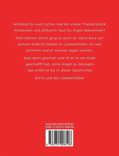 Wolltest Du auch schon mal bei einem Theaterstück mitspielen und plötzlich hast Du Angst bekommen? Dem kleinen Zorro ging es auch so. Ganz kurz vor seinem Auftritt bekam er Lampenfieber. Es war schlimm und er musste sogar weinen. Was dann geschah und ob er es am Ende geschafft hat, seine Angst zu besiegen, das erfährst Du in dieser Geschichte: Zorro und das Lampenfieber.Zorro und das Lampenfieber ist ein Kinderbuch von Kindern für Kinder. Es entstand im Rahmen einer schulischen Projektarbeit im 9. Jahrgang einer Gesamtschule in Schleswig-Holstein.Amelie Schlichting erdachte die Geschichte des jungen Zorro, Amy Quinn hauchte den Figuren der Geschichte mit ihren Illustrationen Leben ein, und Marlon Manger korrigierte und bearbeitete die Texte und Bilder, fügte alles zusammen und organisierte die Produktion des Buches.Das Buch ist ideal als Vorlesebuch geeignet und zum Lesen lernen geeignet. Durch die vielen Illustrationen werden auch die Kleinsten Leseanfänger angesprochen. Es ist in 2 Ausgaben erhältlich, eine Ausgabe in Druckschrift und eine in Schreibschrift (Schulausgangsschrift (SAS)).