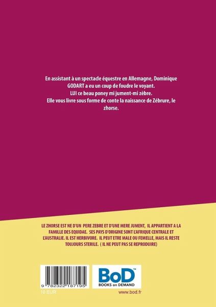 En assistant à un spectacle équestre en Allemagne, Dominique GODART a eu un coup de foudre le voyant. LUI ce beau poney mi jument-mi zèbre. Elle vous livre sous forme de conte la naissance de Zébrure, le zhorse.