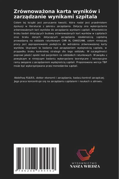 Celem tej ksi¿¿ki jest poruszenie kwestii, która nadal jest przedmiotem dyskusji w literaturze z zakresu zarz¿dzania. Dotyczy ona wykorzystania zrównowäonych kart wyników do zarz¿dzania wynikami szpitali. W kontek¿cie braku badä dotycz¿cych budowy zrównowäonych kart wyników w szpitalach oraz braku danych dotycz¿cych zarz¿dzania dziäalno¿ci¿ szpitaln¿ prowadzon¿ na oddziale ratunkowym CHR AL GHASSANI, celem niniejszej pracy jest zaproponowanie podej¿cia do wdro¿enia zrównowäonej karty wyników. Usprawni to badania nad zarz¿dzaniem wydajno¿ci¿ szpitala, w przypadku braku konkretnej strategii dla tego oddziäu. W szczególno¿ci poprawi jako¿¿ opieki nad pacjentem na oddziäach ratunkowych. W zwi¿zku z powy¿szym w niniejszym badaniu wykorzystano teoretyczne i koncepcyjne ramy zwi¿zane z zarz¿dzaniem wydajno¿ci¿ szpitali. Proponowana wersja TBP mo¿e by¿ wykorzystywana przez mened¿erów szpitali.