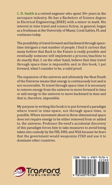 The possibility of travel forward and backward through space-time intrigues a vast number of people. I find it curious that many believe that Back to the Future is really possible and eventually someone will implement a process/machine to do exactly that. I, on the other hand, believe that time travel through space-time is impossible and in this book, I put forward, what I consider to be, a valid proof. The expansion of the universe and ultimately the Heat Death of the Universe means that energy is continuously lost and is not recoverable. To travel through space-time it is necessary to remove energy from the universe to move forward in time or add energy to the universe to move backward in time and that is, therefore, impossible. My purpose in writing this book is to put forward a paradigm where travel in time-space, not through space-time, is possible. Where movement about in three-dimensional space does not require energy to be either removed from or added to, the universe. Professor Da-veed's accidental discovery of this paradigm forces him to take measures to avoid being taken into custody by the FBI, DHS, and NSA because he fears that the government would weaponize ZTAD and use it to dominate other countries.