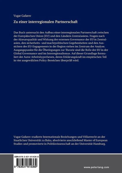 Das Buch untersucht den Aufbau einer interregionalen Partnerschaft zwischen der Europäischen Union (EU) und den Ländern Zentralasiens. Fragen nach der Akteursqualität und Wirkung der externen Governance der EU in Zentralasien, den sicherheits- und machtpolitischen Gegebenheiten und den Aussichten des EU-Engagements in der Region stehen im Zentrum der Analyse. Ausgangspunkte für die Überlegungen zur Theorie sind die Rolle der EU in der Global Governance und im Interregionalismus. Auf dieser Grundlage formuliert der Autor Arbeitshypothesen, deren Erklärungskraft im empirischen Teil in vier ausgewählten Policy-Bereichen überprüft wird.