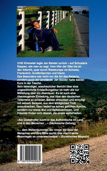 2. Auflage: 3100 Kilometer legte Jan Balster zurück - auf Schusters Rappen, wie man so sagt. Vom Ufer der Elbe bis an den Atlantik, quer durch Westeuropa via Schweiz, Frankreich, Großbritannien und Irland.Das Besondere war nicht nur die Art des Reisens, sondern auch die Umstände: Jan Balster hatte keinen Euro in der Tasche.Sein lebendiger, anschaulicher Bericht über eine ungewöhnliche Entdeckungstour ist mehr als nur Mitteilung über ein Abenteuer. Es ist auch eine überzeugende Einladung, mal über den deutschen Tellerrand zu schauen. Balster ermuntert und ermutigt mit seinem Beispiel, aus dem alltäglichen Trott auszubrechen. Dazu bedarf es keines gefüllten Kontos, sondern nur etwas Mut und Selbstvertrauen. Und Freunde finden sich überall, die einem weiterhelfen.weitere Informationen: https://editioneurasien.de»Als Globetrotter sucht er das Authentische im Land und in den Menschen ...« (Sächsische Zeitung)»... ein echter Weltenbummler ...« (Dresdner Morgenpost)
