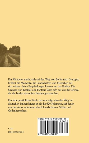 Ein Wanderer macht sich auf den Weg von Berlin nach Stuttgart. Er lässt Momente, die Landschaften und Menschen auf sich wirken. Seine Empfindungen kreisen um das Erlebte. Die Grenzen von Realität und Fantasie lösen sich auf wie die Grenze, die die beiden deutschen Staaten getrennt hat.Ein sehr persönliches Büchlein, das uns zeigt, dass der Weg zur deutschen Einheit länger ist als die 600 Kilometer, auf denen uns der Autor mitnimmt durch Landschaften, Städte und Gedankenwelten.