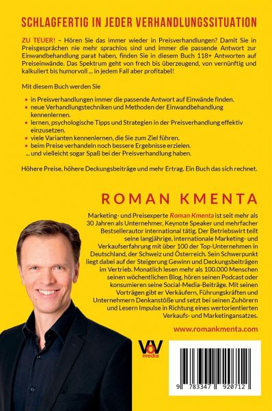 Zu teuer! - Hören Sie das immer wieder in Preisverhandlungen? Damit Sie in Preisgesprächen nie mehr sprachlos sind und immer die passende Antwort zur Einwandbehandlung parat haben, finden Sie in diesem Buch 118 Antworten auf Preiseinwände. Das Spektrum geht von frech bis überzeugend, von vernünftig und kalkuliert bis humorvoll. In jedem Fall aber profitabel.Mit diesem Buch werden Sie:-in Preisverhandlungen immer die passende Antwort auf Einwände finden-neue Verhandlungstechniken und Methoden der Einwandbehandlung kennenlernen-lernen, psychologische Tipps und Strategien in der Preisverhandlung effektiv einzusetzen-Ihre Verhandlungsführung erfolgreicher machen-beim Preise verhandeln bessere Ergebnisse erzielen-mehr Spaß bei der Preisverhandlung haben