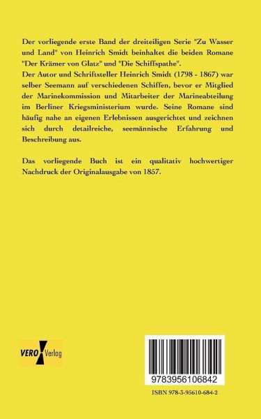Der vorliegende erste Band der dreiteiligen Serie "Zu Wasser und Land" von Heinrich Smidt beinhaltet die beiden Romane "Der Krämer von Glatz" und "Die Schiffspathe".