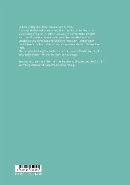 In diesem Ratgeber dreht sich alles um Zucchini.Der erste Teil beinhaltet alles von Zahlen und Fakten bis hin zu den verschiedensten grünen, gelben und weißen Sorten. Natürlich darf auch das Wissen über den Anbau sowie über Krankheiten und Schädlinge und deren Bekämpfung nicht fehlen. Im Rahmen einer natürlichen Schädlingsbekämpfung bekommen auch die Nützlinge ihren Platz. Ebenso geht der Ratgeber auf Menschen ein, welche Zucchini nicht selbst anbauen (können) - mit den richtigen Einkaufstipps!Zu guter Letzt geht es in Teil 1 um die Zucchini-Aufbewahrung, die Zucchini-Vergiftung und über die allgemeine Verwendung.Im 2. Teil gibt es dann allerlei vegane und vegetarische, aber auch fleischhaltige und ein fischhaltiges Rezept(e). Da ist sicher für jede Person etwas dabei.