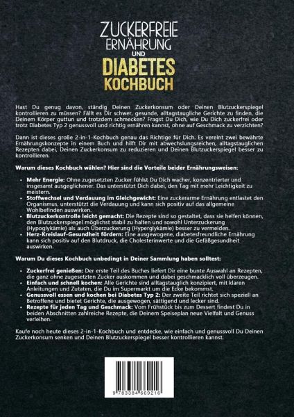 Hast Du genug davon, ständig Deinen Zuckerkonsum oder Deinen Blutzuckerspiegel kontrollieren zu müssen? Fällt es Dir schwer, gesunde, alltagstaugliche Gerichte zu finden, die Deinem Körper guttun und trotzdem schmecken? Fragst Du Dich, wie Du Dich zuckerfrei oder trotz Diabetes Typ 2 genussvoll und richtig ernähren kannst, ohne auf Geschmack zu verzichten?Dann ist dieses große 2-in-1-Kochbuch genau das Richtige für Dich. Es vereint zwei bewährte Ernährungskonzepte in einem Buch und hilft Dir mit abwechslungsreichen, alltagstauglichen Rezepten dabei, Deinen Zuckerkonsum zu reduzieren und Deinen Blutzuckerspiegel besser zu kontrollieren.Warum dieses Kochbuch wählen? Hier sind die Vorteile beider Ernährungsweisen:- Mehr Energie: Ohne zugesetzten Zucker fühlst Du Dich wacher, konzentrierter und insgesamt ausgeglichener. Das unterstützt Dich dabei, den Tag mit mehr Leichtigkeit zu meistern.- Stoffwechsel und Verdauung im Gleichgewicht: Eine zuckerarme Ernährung entlastet den Organismus, unterstützt die Verdauung und kann sich positiv auf das allgemeine Wohlbefinden auswirken.- Blutzuckerkontrolle leicht gemacht: Die Rezepte sind so gestaltet, dass sie helfen können, den Blutzuckerspiegel möglichst stabil zu halten und sowohl Unterzuckerung (Hypoglykämie) als auch Überzuckerung (Hyperglykämie) besser zu vermeiden.- Herz-Kreislauf-Gesundheit fördern: Eine ausgewogene, diabetesfreundliche Ernährung kann sich positiv auf den Blutdruck, die Cholesterinwerte und die Gefäßgesundheit auswirken.Warum Du dieses Kochbuch unbedingt in Deiner Sammlung haben solltest:- Zuckerfrei genießen: Der erste Teil des Buches liefert Dir eine bunte Auswahl an Rezepten, die ganz ohne zugesetzten Zucker auskommen und dabei geschmacklich voll überzeugen.- Einfach und schnell kochen: Alle Gerichte sind alltagstauglich konzipiert, mit klaren Anleitungen und Zutaten, die Du im Supermarkt um die Ecke bekommst.- Genussvoll essen und kochen bei Diabetes Typ 2: Der zweite Teil richtet sich speziell an Betroffene und bietet Gerichte, die ausgewogen, sättigend und lecker sind.- Rezepte für jeden Tag und Geschmack: Vom Frühstück bis zum Dessert findest Du in beiden Abschnitten zahlreiche Rezepte, die Deinem Speiseplan neue Vielfalt und Genuss verleihen.Kaufe noch heute dieses 2-in-1-Kochbuch und entdecke, wie einfach und genussvoll Du Deinen Zuckerkonsum senken und Deinen Blutzuckerspiegel besser kontrollieren kannst.