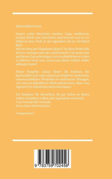Spiritualität boomt.Immer mehr Menschen machen Yoga, meditieren, senden Briefe ans Universum und strotzen nur so vor Glück und Optimismus, in einer Welt, in der eigentlich viel zu viel falsch läuft.Was ist dran am "Happiness-Hype"?Ist diese Positivität forciert und ignorant oder wirklich authentisch? Muss man auf diesen Zug aufspringen, um ein glücklicheres Leben zu führen? Aber was, wenn man damit so gar nichts anfangen kann?Dieser Ratgeber schaut hinter die Kulissen der Spiritualität und zeigt anhand persönlicher Anekdoten, wissenschaftlicher Perspektiven und kurzer Übungen, wie man ein Scheibchen Glück abbekommt, ohne vom eigenen (Un-)Glaubenssystem abzulassen.Ein Ratgeber für Menschen, die gar nicht so viel and ihrem Leben verändern wollen.Von Normalo für Normalo.Ganz ohne Gehirnwäsche.Versprochen!
