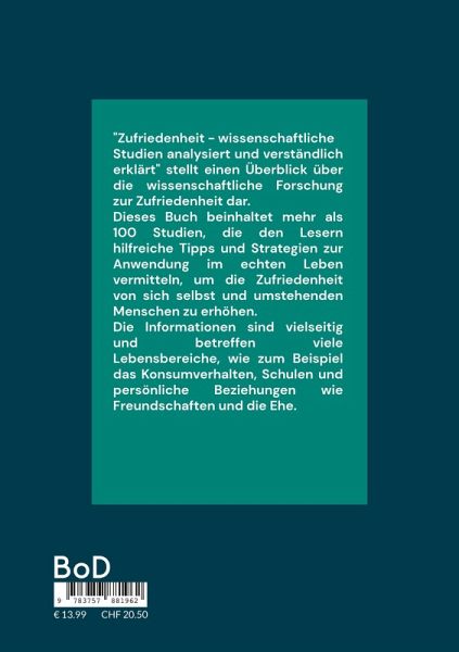 Zufriedenheit - wissenschaftliche Studien analysiert und verständlich erklärt stellt einen Überblick über die wissenschaftliche Forschung zur Zufriedenheit dar. Dieses Buch beinhaltet mehr als 100 Studien, die den Lesern hilfreiche Tipps und Strategien zur Anwendung im realen Leben vermitteln, um die Zufriedenheit von sich selbst und umstehenden Menschen zu erhöhen. Die Informationen sind vielseitig und betreffen viele Lebensbereiche, wie zum Beispiel das Konsumverhalten, Schulen und persönliche Beziehungen wie Freundschaften und die Ehe.