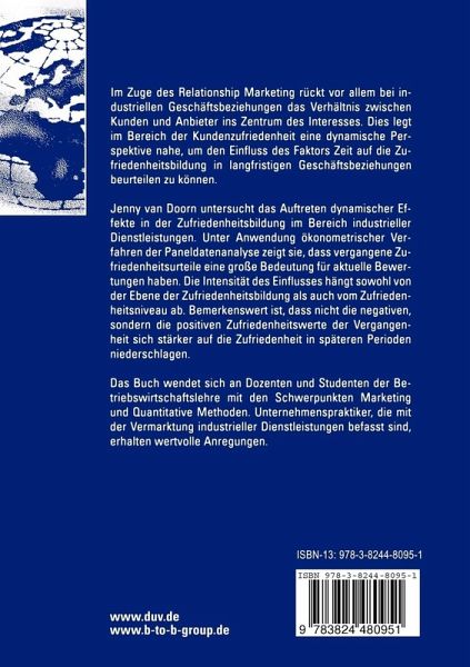 Jenny van Doorn untersucht das Auftreten dynamischer Effekte in der Zufriedenheitsbildung im Bereich industrieller Dienstleistungen. Unter Anwendung ökonometrischer Verfahren der Paneldatenanalyse zeigt sie, dass vergangene Zufriedenheitsurteile eine große Bedeutung für aktuelle Bewertungen haben. Die Intensität des Einflusses hängt sowohl von der Ebene der Zufriedenheitsbildung als auch vom Zufriedenheitsniveau ab. Bemerkenswert ist, dass nicht die negativen, sondern die positiven Zufriedenheitswerte der Vergangenheit sich stärker auf die Zufriedenheit in späteren Perioden niederschlagen.