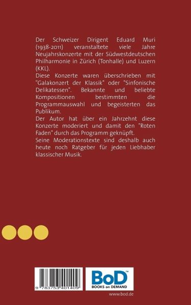 Der Schweizer Dirigent Eduard Muri (1938-2011) veranstaltete viele Jahre Neujahrskonzerte mit der Südwestdeutschen Philharmonie in Zürich (Tonhalle) und Luzern (KKL). Diese Konzerte waren überschrieben mit "Galakonzert der Klassik" oder "Sinfonische Delikatessen". Bekannte und beliebte Kompositionen bestimmten die Programmauswahl und begeisterten das Publikum.Der Autor hat über ein Jahrzehnt diese Konzerte moderiert und damit den "roten Faden" durch das Programm gesponnen.Seine Moderationstexte sind deshalb auch heute noch Ratgeber für jeden Liebhaber klassischer Musik.
