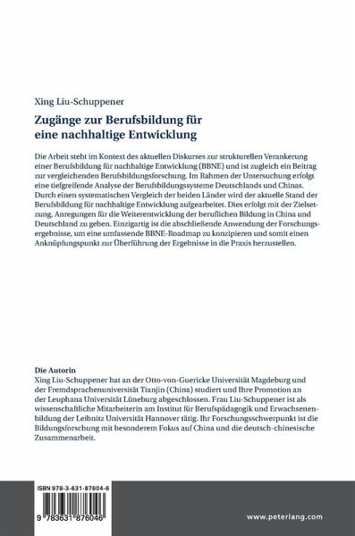 Die Arbeit steht im Kontext des aktuellen Diskurses zur strukturellen Verankerung einer Berufsbildung für nachhaltige Entwicklung (BBNE) und ist zugleich ein Beitrag zur vergleichenden Berufsbildungsforschung. Im Rahmen der Untersuchung erfolgt eine tiefgreifende Analyse der Berufsbildungssysteme Deutschlands und Chinas. Durch einen systematischen Vergleich der beiden Länder wird der aktuelle Stand der Berufsbildung für nachhaltige Entwicklung aufgearbeitet. Dies erfolgt mit der Zielsetzung, Anregungen für die Weiterentwicklung der beruflichen Bildung in China und Deutschland zu geben. Einzigartig ist die abschließende Anwendung der Forschungsergebnisse, um eine umfassende BBNE-Roadmap zu konzipieren und somit einen Anknüpfungspunkt zur Überführung der Ergebnisse in die Praxis herzustellen.