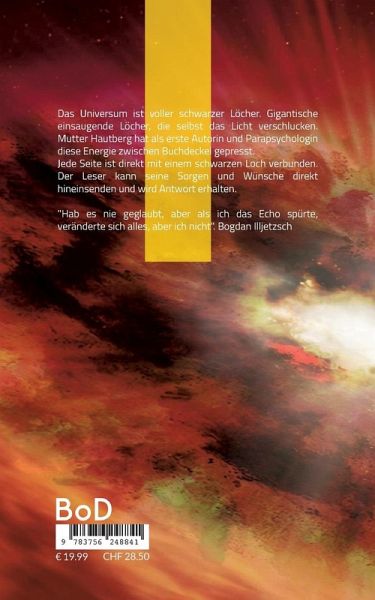 Das Universum ist voller schwarzer Löcher. Gigantische einsaugende Löcher, die selbst das Licht verschlucken. Mutter Hautberg hat als erste Autorin und Parapsychologin diese Energie zwischen Buchdeckel gepresst. Jede Seite ist direkt mit einem schwarzen Loch verbunden. Der Leser kann seine Sorgen und Wünsche direkt hineinsenden und wird Antwort erhalten. "Hab es nie geglaubt, aber als ich das Echo spürte, veränderte sich alles, aber ich nicht". Bogdan Illjetzsch