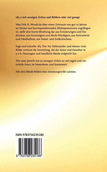 183 x mit wenigen Zeilen und Bildern sehr viel gesagtWas Dirk H. Wendt da über einen Zeitraum von gut 10 Jahrenan Versen und korrespondierenden Bildimpressionen zugeflogenist, stellt eine bunte Mischung dar aus Erinnerungen und Ein-drücken, aus Humorigem und Merk-Würdigem, aus Satirischemund Fabelhaftem, aus Sozial- und Zeitkritischem.Sage und schreibe 183 Vier- bis Siebenzeiler und ebenso vieleBilder umfasst die Sammlung, die der Autor und Gestalter in3 x 61 Paarungen und handliche Bände aufgeteilt hatWie man jeweils mit so wenigen Zeilen so viel sagen und ver-mitteln kann, ist bemerkens- und lesenswert.Alle drei Bände bilden eine stimmungsvolle Lektüre.
