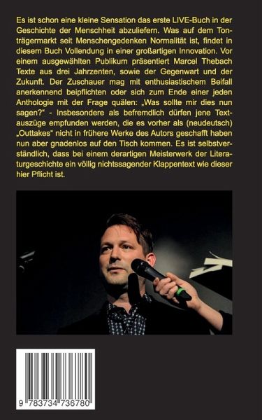 Soviel steht fest - "Zugemauerte Pufftüren" ist mitnichten ein Buch für die Masse. Man mag dies als schlechtes Marketing auslegen, aber ein solches Maß an Fairness muss sein. Dieses Werk ist nur für absolute Fans des gehobenen Unsinns eine Empfehlung, alle anderen seien an dieser Stelle vor dem Kauf ausdrücklich gewarnt:Es ist schon eine kleine Sensation das erste LIVE-Buch in der Geschichte der Menschheit abzuliefern. Was auf dem Tonträgermarkt seit Menschengedenken Normalität ist, findet in diesem Buch Vollendung in einer großartigen Innovation. Vor einem ausgewählten Publikum präsentiert Marcel Thebach Texte aus drei Jahrzenten, sowie der Gegenwart und der Zukunft. Der Zuschauer mag mit enthusiastischem Beifall anerkennend beipflichten oder sich zum Ende einer jeden Anthologie mit der Frage quälen: "Was sollte mir dies nun sagen?" - Insbesondere als befremdlich dürfen jene Textauszüge empfunden werden, die es vorher als (neudeutsch) "Outtakes" nicht in frühere Werke des Autors geschafft haben und nun aber gnadenlos auf den Tisch kommen. Es ist selbstverständlich, dass bei einem derartigen Meisterwerk der Literaturgeschichte ein völlig nichtssagender Klappentext wie dieser hier Pflicht ist.