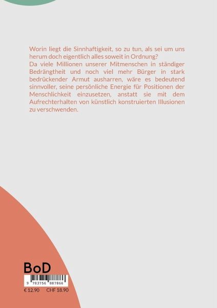 Worin liegt die Sinnhaftigkeit, so zu tun, als sei um uns herum doch eigentlich alles soweit in Ordnung?Da viele Millionen unserer Mitmenschen in ständiger Bedrängtheit und noch viel mehr Bürger in stark bedrückender Armut ausharren, wäre es bedeutend sinnvoller, seine persönliche Energie für Positionen der Menschlichkeit einzusetzen, anstatt sie mit dem Aufrechterhalten von künstlich konstruierten Illusionen zu verschwenden.