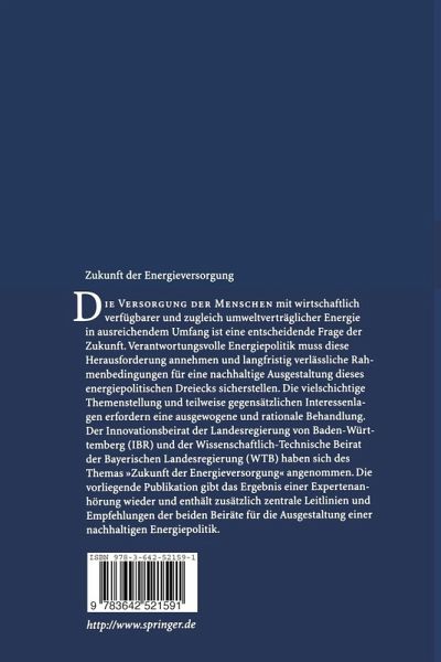 Die Versorgung der Menschen mit wirtschaftlich verfügbarer und zugleich umweltverträglicher Energie in ausreichendem Umfang ist eine entscheidende Frage der Zukunft. Verantwortungsvolle Energiepolitik muss diese Herausforderung annehmen und langfristig verlässliche Rahmenbedingungen für eine nachhaltige Ausgestaltung dieses energiepolitischen Dreiecks sicherstellen. Die vielschichtige Themenstellung und teilweise grundsätzlichen Interessenlagen erfordern eine ausgewogene und rationale Behandlung. Der Innovationsbeirat der Landesregierung von Baden-Württemberg (IBR) und der Wissenschaftlich-Technische Beirat der Bayerischen Staatsregierung (WTB) haben sich des Themas 'Zukunft der Energieversorgung' angenommen. Die vorliegende Publikation gibt das Ergebnis einer Expertenanhörung wieder und enthält zusätzlich zentrale Leitlinien und Empfehlungen der beiden Beiräte für die Ausgestaltung einer nachhaltigen Energiepolitik.