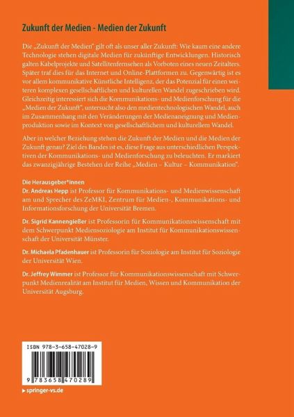 Die "Zukunft der Medien" gilt oft als unser aller Zukunft: Wie kaum eine andere Technologie stehen digitale Medien für zukünftige Entwicklungen. Historisch galten Kabelprojekte und Satellitenfernsehen als Vorboten eines neuen Zeitalters. Später traf dies für das Internet und Online-Plattformen zu. Gegenwärtig ist es vor allem kommunikative Künstliche Intelligenz, der das Potenzial für einen weiteren komplexen gesellschaftlichen und kulturellen Wandel zugeschrieben wird. Gleichzeitig interessiert sich die Kommunikations- und Medienforschung für die "Medien der Zukunft", untersucht also den medientechnologischen Wandel, auch im Zusammenhang mit den Veränderungen der Medienaneignung und Medienproduktion sowie im Kontext von gesellschaftlichem und kulturellem Wandel.