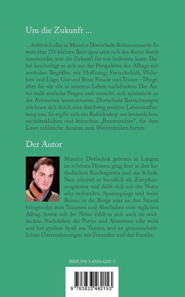 Um die Zukunft dreht sich alles in Maurice Diwischeks Kolumnenserie. In weit über 150 kleinen Beiträgen setzt sich der Autor damit auseinander, was die Zukunft für uns bedeuten kann. Dabei beschäftigt er sich aus der Perspektive des Alltags mit zentralen Begriffen wie Hoffnung, Freundschaft, Wahrheit und Lüge, Gut und Böse, Freude und Trauer - Dinge, über die wir alle in unserem Leben nachdenken. Der Autor stellt einfache Fragen und versucht, sich spielerisch an die Antworten heranzutasten. Diwischeks Betrachtungen zeichnen sich durch eine durchweg positive Lebensauffassung aus. So ergibt sich ein Kaleidoskop aus besinnlichen, nachdenklichen und kritischen "Bausteinchen", die dem Leser zahlreiche Ansätze zum Weiterdenken bieten.
