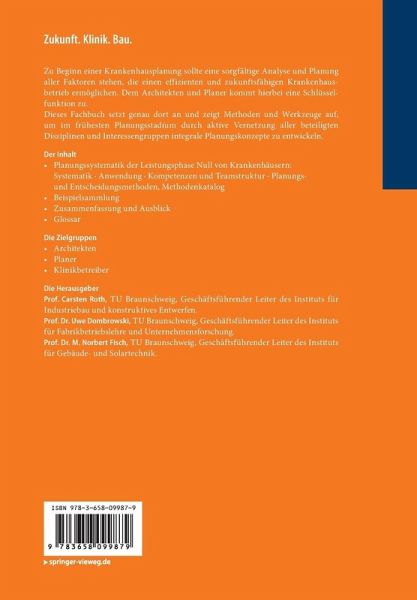 Einleitung.- Planungssystematik der Leistungsphase Null von Krankenhäusern.- Systematik.- Anwendung.- Kompetenzen und Teamstruktur.- Planungs- und Entscheidungsmethoden, Methodenkatalog.- Beispielsammlung.- Zusammenfassung und Ausblick.- Glossar.