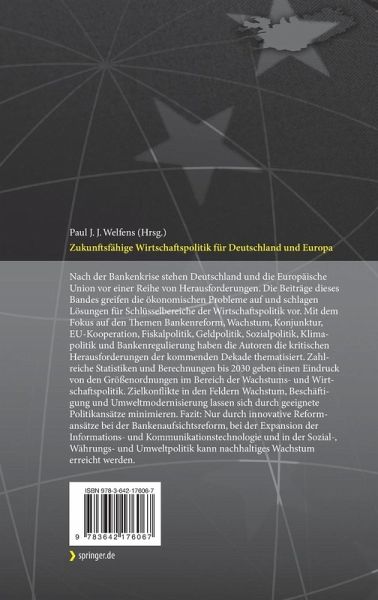 Nach der Bankenkrise stehen Deutschland und die Europäische Union vor einer Reihe von Herausforderungen. Die Beiträge dieses Bandes greifen die ökonomischen Probleme auf und schlagen Lösungen für Schlüsselbereiche der Wirtschaftspolitik vor. Mit dem Fokus auf den Themen Bankenreform, Wachstum, Konjunktur, EU-Kooperation, Fiskalpolitik, Geldpolitik, Sozialpolitik, Klimapolitik und Bankenregulierung haben die Autoren die kritischen Herausforderungen der kommenden Dekade thematisiert. Zahlreiche Statistiken und Berechnungen bis 2030 geben einen Eindruck von den Größenordnungen im Bereich der Wachstums- und Wirtschaftspolitik. Zielkonflikte in den Feldern Wachstum, Beschäftigung und Umweltmodernisierung lassen sich durch geeignete Politikansätze minimieren. Fazit: Nur durch innovative Reformansätze bei der Bankenaufsichtsreform, bei der Expansion der Informations- und Kommunikationstechnologie und in der Sozial-, Währungs- und Umweltpolitik kann nachhaltiges Wachstum erreicht werden.
