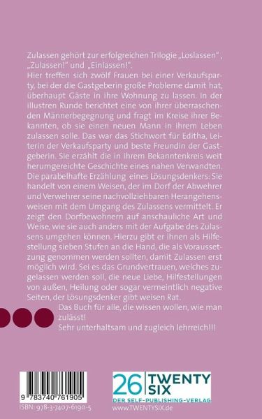 Zulassen gehört zur erfolgreichen Trilogie "Loslassen", "Zulassen!" und "Einlassen!".Hier treffen sich zwölf Frauen bei einer Verkaufsparty, bei der die Gastgeberin große Probleme damit hat, überhaupt Gäste in ihre Wohnung zu lassen. In der illustren Runde berichtet eine von ihrer überraschenden Männerbegegnung und fragt im Kreise ihrer Bekannten, ob sie einen neuen Mann in ihrem Leben zulassen solle. Das war das Stichwort für Editha, Leiterin der Verkaufsparty und beste Freundin der Gastgeberin. Sie erzählt die in ihrem Bekanntenkreis weit herumgereichte Geschichte eines nahen Verwandten. Die parabelhafte Erzählung eines Lösungsdenkers: Sie handelt von einem Weisen, der im Dorf der Abwehrer und Verwehrer seine nachvollziehbaren Herangehensweisen mit dem Umgang des Zulassens vermittelt. Er zeigt den Dorfbewohnern auf anschauliche Art und Weise, wie sie auch anders mit der Aufgabe des Zulassens umgehen können. Hierzu gibt er ihnen als Hilfestellung sieben Stufen an die Hand, die als Voraussetzung genommen werden sollten, damit Zulassen erst möglich wird. Sei es das Grundvertrauen, welches zugelassen werden soll, die neue Liebe, Hilfestellungen von außen, Heilung oder sogar vermeintlich negative Seiten, der Lösungsdenker gibt weisen Rat.Das Buch für alle, die wissen wollen, wie man zulässt!Sehr unterhaltsam und zugleich lehrreich!!!
