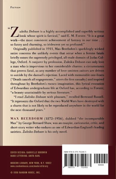 Originally published in 1911, Max Beerbohm's sparklingly wicked satire concerns the unlikely events that occur when a femme fatale briefly enters the supremely privileged, all-male domain of Judas College, Oxford. A conjurer by profession, Zuleika Dobson can only love a man who is impervious to her considerable charms: a circumstance that proves fatal, as any number of love-smitten suitors are driven to suicide by the damsel's rejection. Laced with memorable one-liners ("Death cancels all engagements", utters the first casualty) and inspired throughout by Beerbohm's rococo imagination, this lyrical evocation of Edwardian undergraduate life at Oxford has, according to Forster, "a beauty unattainable by serious literature".