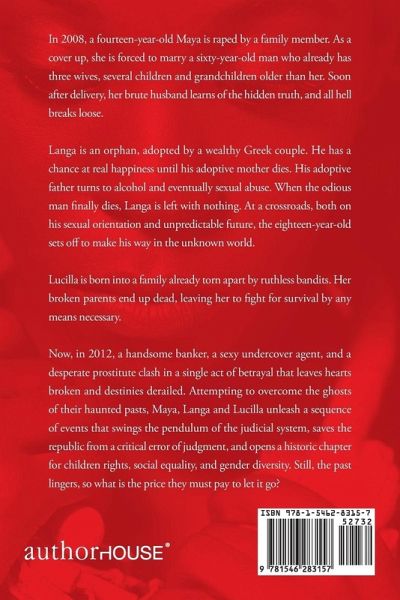 In 2008, a fourteen-year-old Maya is raped by a family member. As a cover up, she is forced to marry a sixty-year-old man who already has three wives, several children and grandchildren older than her. Soon after delivery, her brute husband learns of the hidden truth, and all hell breaks loose. Langa is an orphan, adopted by a wealthy Greek couple. He has a chance at real happiness until his adoptive mother dies. His adoptive father turns to alcohol and eventually sexual abuse. When the odious man finally dies, Langa is left with nothing. At a crossroads, both on his sexual orientation and unpredictable future, the eighteen-year-old sets off to make his way in the unknown world. Lucilla is born into a family already torn apart by ruthless bandits. Her broken parents end up dead, leaving her to fight for survival by any means necessary. Now, in 2012, a handsome banker, a sexy undercover agent, and a desperate prostitute clash in a single act of betrayal that leaves hearts broken and destinies derailed. Attempting to overcome the ghosts of their haunted pasts, Maya, Langa and Lucilla unleash a sequence of events that swings the pendulum of the judicial system, saves the republic from a critical error of judgment, and opens a historic chapter for children rights, social equality, and gender diversity. Still, the past lingers, so what is the price they must pay to let it go?